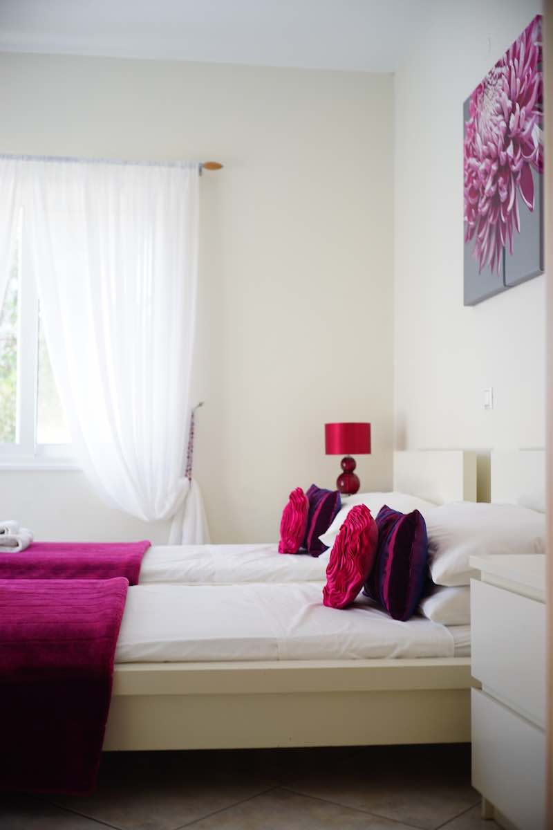 The `Dahlia` room, decorated with splashes of raspberry pink, designed to compliment the master bedroom, just a few steps away which is especially useful for families. The bedroom comes with an ensuite bathroom, equipped with both bath and a shower which is a rarity in Greece. A private balcony with table and chairs provides yet another place to look at the truly stunning views that the villa has to offer.