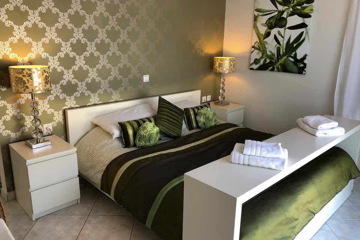 The `Olive` Master bedroom, with hints of boutique style living and splashes of olive greens. It has a sumptuous king size bed, a double ensuite shower bathroom with a large private balcony with bistro table and chairs. Stunning views of the mountains and sea below, it is a fantastic room to watch the sun rise whilst staying in the sanctuary of your own bed.