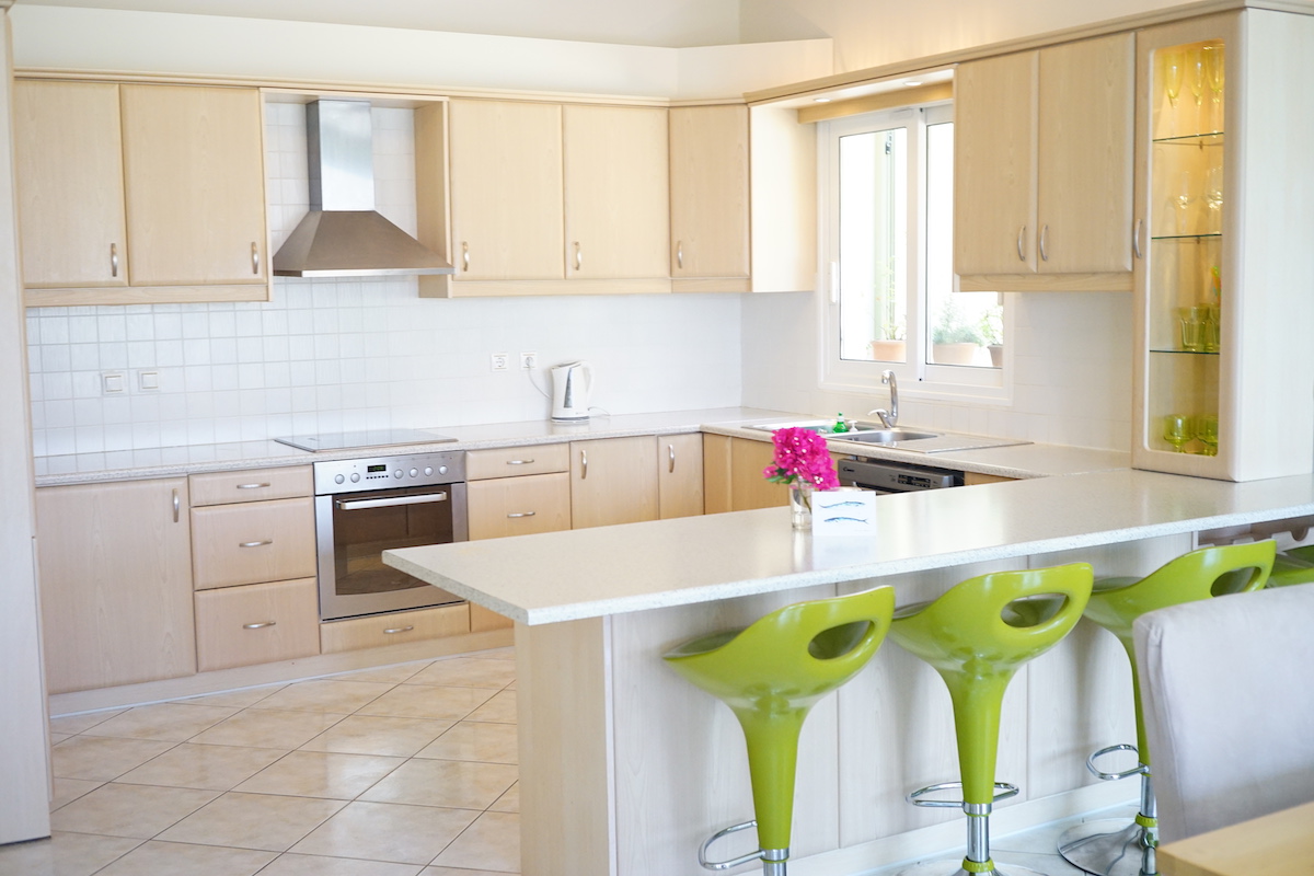 The kitchen, a perfect place for preparing, snacking and chatting. The kitchen is large, spacious, and fully equipped to a high standard. Friends can gather, pull up a stool and share a glass of wine. It is a minimal, easy to maintain space and a pleasure to cook in. Fresh white china crockery, hand blown wine glasses, champagne flutes, cocktail glasses, a full range of brightly coloured acrylic tableware for outside use, pots, pans, microwave, fridge, freezer, dishwasher, the list is endless ...