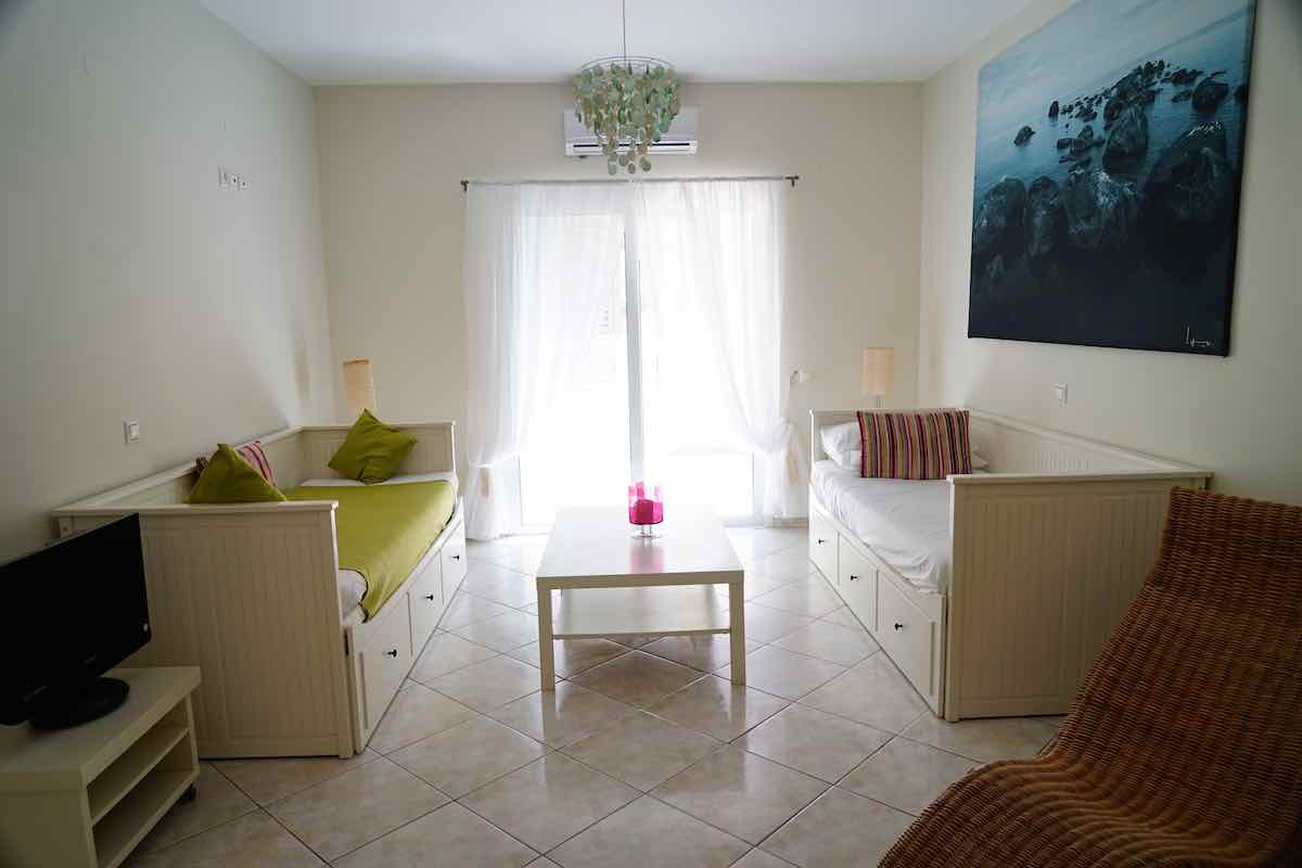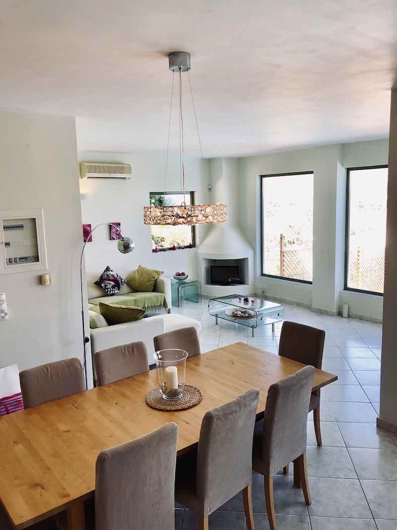 If you prefer to dine alfresco style, simply cross the threshold onto the undercover terrace. A relaxing dining space shaded in readiness for the mid day temperatures. Friends and family can gather around the rattan table and cream cushioned dining chairs to share delicious Greek delights. Lots of the local tevernas provide takeaway. As evenings draws, lanterns and candles are lit for sunset cocktails, chilled glasses of wine, where swallows swoop across the stillness of the infinity pool .