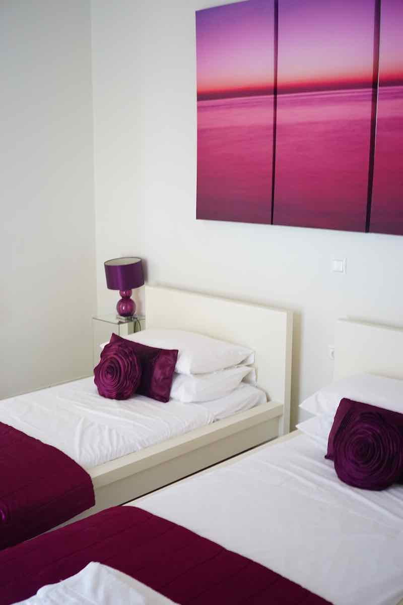 The `Sunset` room comes in accents of aubergine and cerise. This indulgent sleeping space has twin beds, with patio doors opening onto the terrace overlooking the infinity pool and views beyond. Another set of patio doors opens onto a private patio area where seating is available to relax, read and drink endless cups of coffee. Fully equipped with ensuite shower room, this room is deal for older guests that prefer not to climb the marble staircase to the first floor.
